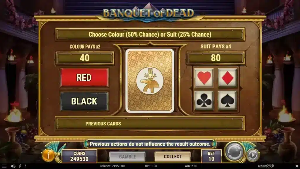 After a win occurs in the base game, you will be given the option to Gamble the total amount won for more by choosing either a colour playing card or suit. If your gamble is unsuccessful, you will return to the base game empty-handed. However, if the gamble is successful, your total win amount will increase accordingly.