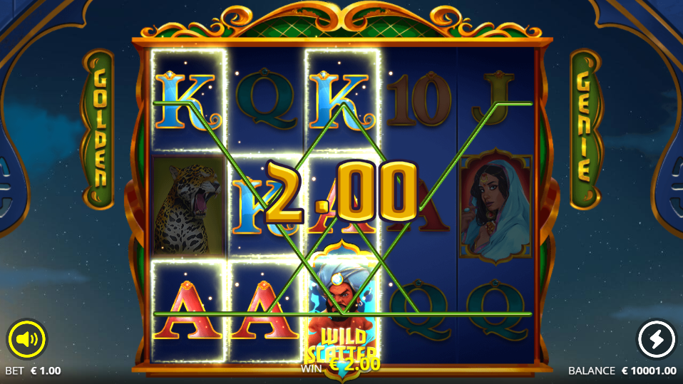 To start a Genie Parade, you need to land 3 or more Genie scatter symbols anywhere on the reels. The Genie Parade represents the primary income-generating feature and where the game’s maximum win potential is achieved. Upon triggering, one of your scattered Genies becomes the Golden Genie, whilst others act as walking wilds. All Genies start with a 1x multiplier.