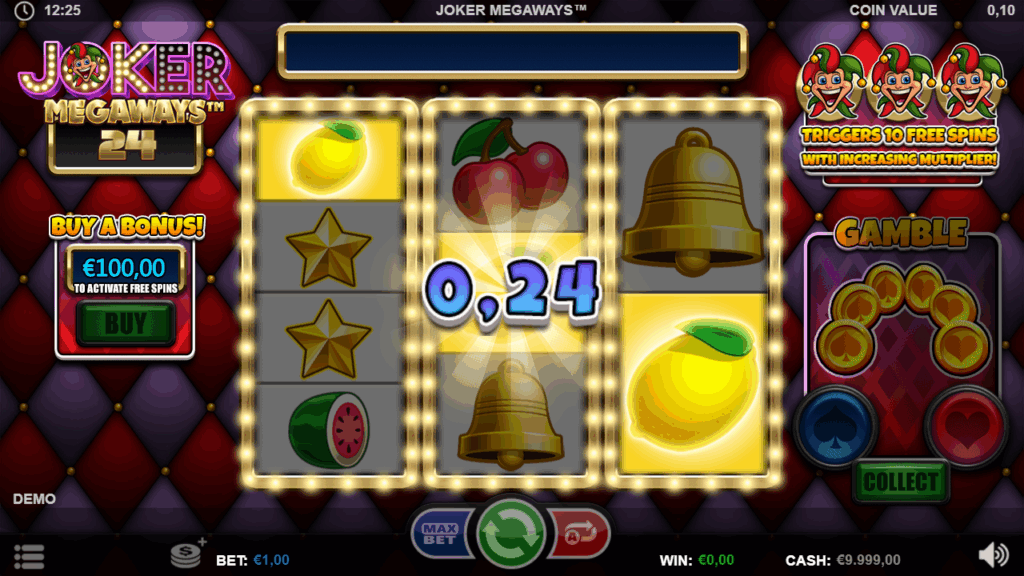 Joker Megaways offers an extensive betting range with a minimum bet of €0.10 and a maximum bet of €100 per spin. The unusually high maximum bet for a Megaways slot makes it accessible to both casual players seeking lower stakes and high-stakes players willing to bet the maximum. This wide range is a genuine differentiator in the Megaways landscape. -