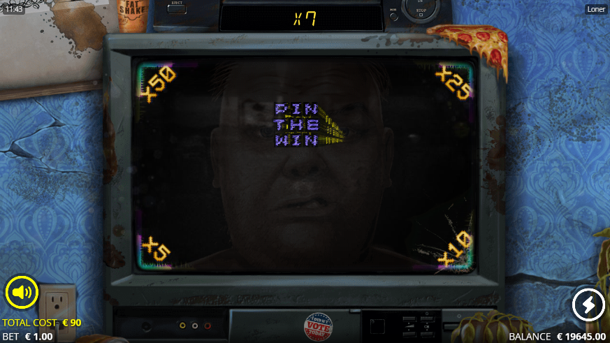 Loner operates on a standard 5-reel, 3-row grid with 243 ways to win. The game’s visual presentation centres on Bob Bobsburg—an overweight, unhealthy character sat at a desk watching a retro television whilst consuming pizza and milkshakes. This darkly comedic character study serves as the thematic anchor for all bonus gameplay. The core mechanics revolve around Monitor scatter symbols that trigger across reels 1, 3, and 5, activating one of four outcomes: Pin The Win, Tick Tick Boom, Shoot Shoot Duck, or a MAX Win symbol.
