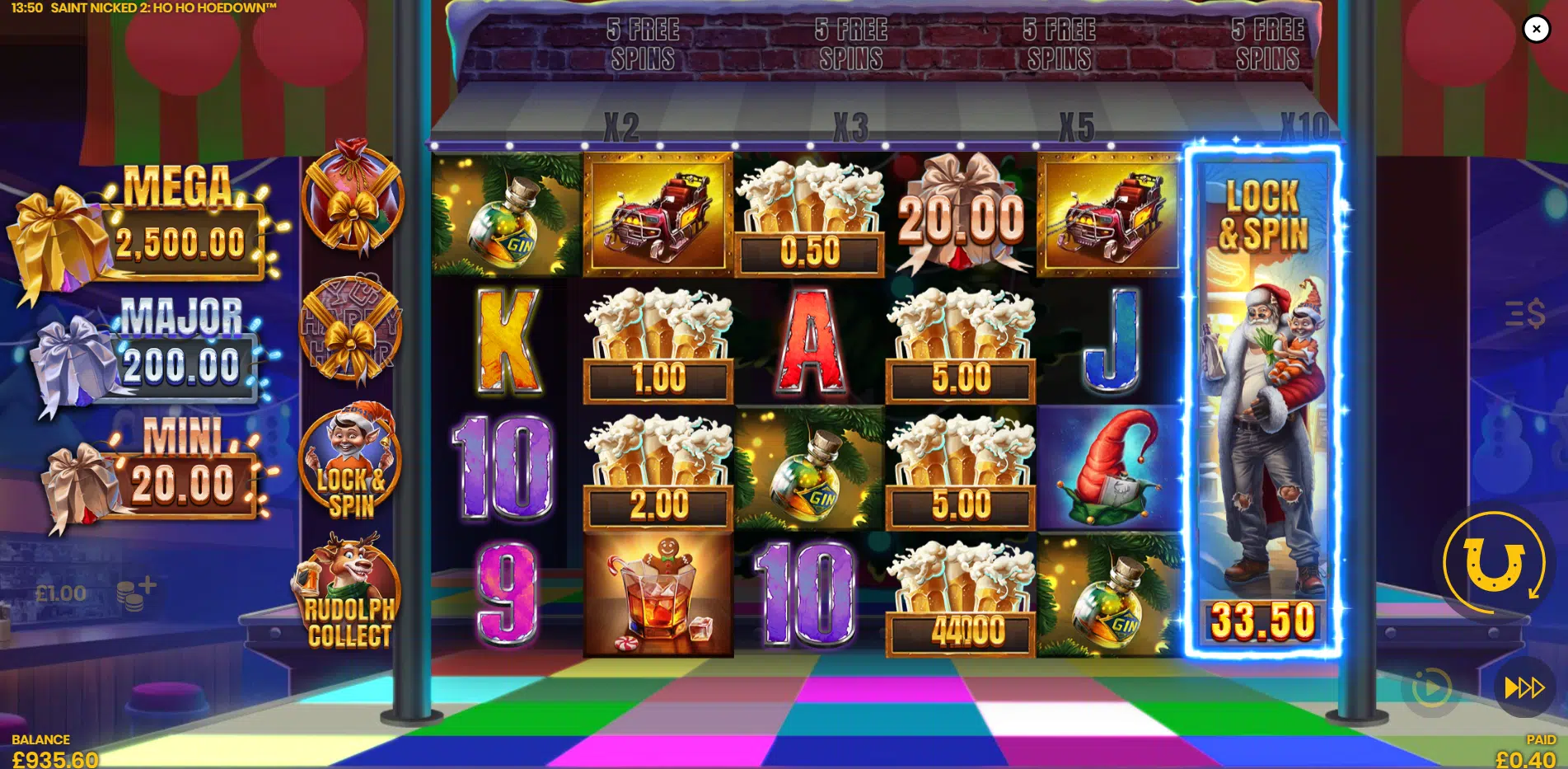 Saint Nicked 2 features the progressive Cash Collect system with unlockable modifiers (Santa, Rudolph, Lock & Spin, Happy Hour), Wild Symbols that expand across reels 2–6, Collect Bonus functionality that persists through free spins, Santa Free Spins with a progressive multiplier bar reaching 10x, and three Jackpot tiers (Mini 20x, Major 200x, Mega 2,500x). The progression system is the mechanical centrepiece – modifiers remain active once unlocked throughout your entire session. -
