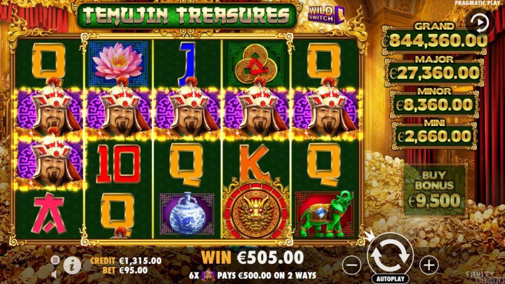 The maximum win in Temujin Treasures is 9,000x your stake. The Grand Jackpot within the Wheel feature is capped at 8,888x. Players can approach the overall 9,000x through combinations of Wheel payouts and Firecracker wild multipliers during free spins. -