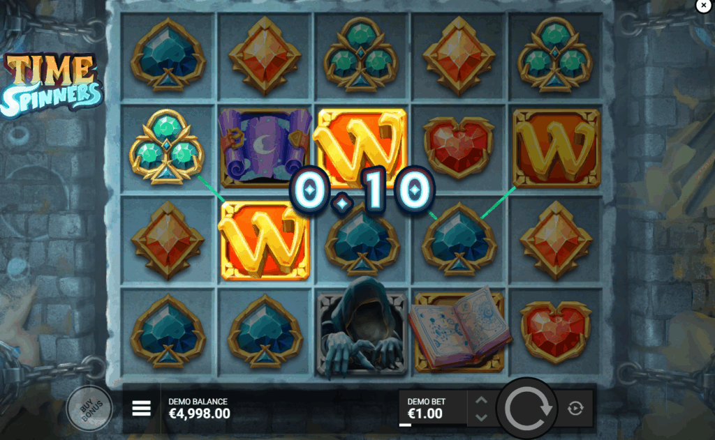 Time Spinners operates on a 5-reel, 4-row grid with 10 paylines—a structure that feels restrained compared to the Megaways trend dominating the market. The game’s visual design emphasises the ancient temple atmosphere, with symbols reflecting its dark sorcery theme. The base game focuses heavily on the Wild Multiplier system as its core mechanic, making standard spins feel purposeful rather than merely filler between features.